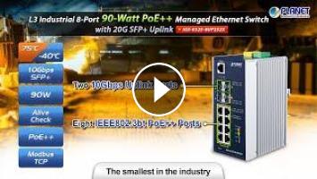 Designed for smart factories, smart cities and intelligent transportation system, PLANET IGS-6325-8UP2S2X L3 Industrial 8-Port 90-Watt PoE++ Managed Ethernet Switch with 20G SFP+ Uplink features IEEE 802.3bt PoE++, Layer 3 IP routing, Modbus TCP Protocol, ERPS fast recovery and ONVIF management for various network deployment options.