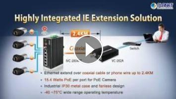 To fulfill the demand of long-distance data transmission in harsh environment such as highway, city sewer and tunnel, PLANET Industrial VDSL2 / PoE Ethernet Extender (-40 ~ 75°C), IVC-2004PT, can extend high-speed data and power transmission up to 2.4KM through existing coaxial cable (BNC) or telephone wire (RJ-11), in which it extends 24 times longer distance than through 100 meters Ethernet cable.