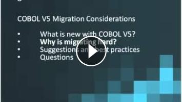 This presentation will summarize some of the key points that you need to consider before and during your migration to COBOL V5. You’ll discover why COBOL V5 is so different than earlier COBOL versions, what is unique about this migration, and some best practices on how to address known issues.