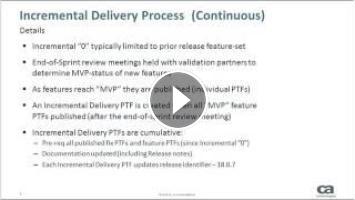 The CA Incremental Release delivery methodology expedites delivery of new product features to enables customers to gain the benefits as soon as they are deemed ready by the validation partner team members. Join CA Endevor® Software Change Manager product owner Pete McCullough and Product Marketing Manager Marvin Mao for an overview of this delivery methodology and customer tips on realizing its benefits. New features released with v18 will also be reviewed.