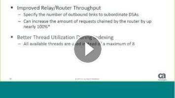 An overview of the new features in the last two releases 12.5 and 12.6. This session should be of interest to those using CA Directory, CA IMAG, and CA SSO.